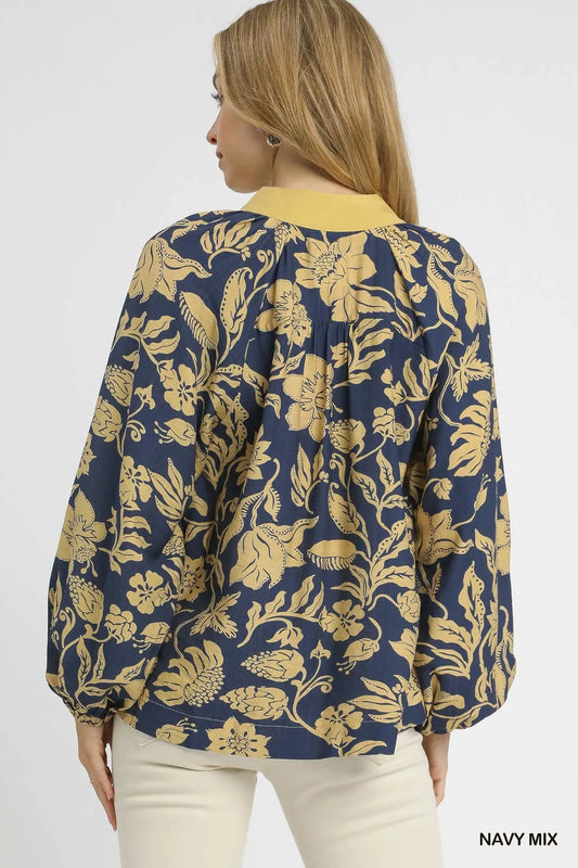 Jacquard Textured Leaf Button-Down Blouse