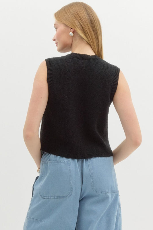 Solid Black Sleeveless Knit Top W/ Gold Buttons